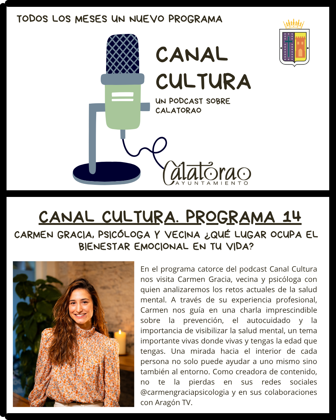 En el programa catorce del podcast Canal Cultura nos visita Carmen Gracia, vecina y psicóloga con quien analizaremos los retos actuales de la salud mental. A través de su experiencia profesional, Carmen nos guía en una charla imprescindible sobre la prevención, el autocuidado y la importancia de visibilizar la salud mental, un tema importante vivas donde vivas y tengas la edad que tengas. Una mirada hacia el interior de cada persona no solo puede ayudar a uno mismo sino también al entorno. Como creadora de contenido, no te la pierdas en sus redes sociales @carmengraciapsicologia y en sus colaboraciones con Aragón TV.