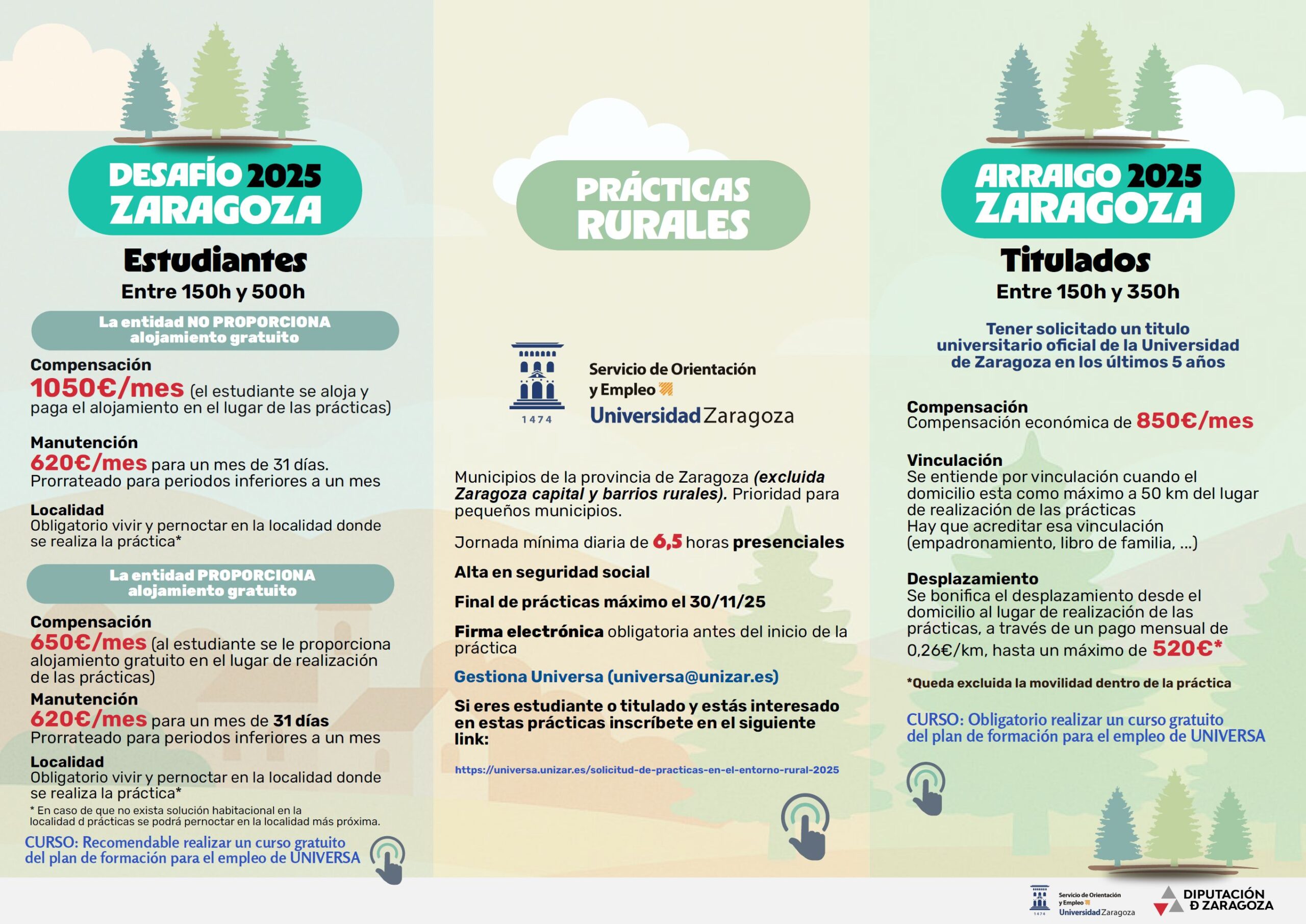 “Desafío Zaragoza”, destinado a estudiantes universitarios de últimos cursos que deseen explorar el medio rural como posible mercado laboral. A estas prácticas pueden adherirse empresas de todos los sectores industriales, instituciones públicas, fundaciones, ONG vinculadas al territorio, etc. de la provincia de Zaragoza, excluida su capital y barrios rurales.